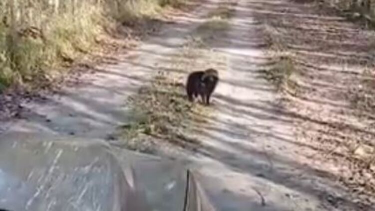 На кадрах видно, как животное стоит на дороге, а при виде автомобиля с людьми начинает идти им навстречу.