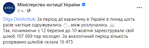 С 12 марта до 10 октября в Украине брак зарегистрировали 107 069 пар. Фото: facebook.com