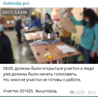 "08:09, должны были открыться участки и люди уже должны были начать голосовать. Но, многие участки не готовы к работе", - написал Дубинский в своем телеграмм-канале.