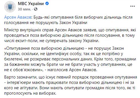 10:58 Глава МВД Арсен Аваков сообщил, что любые опросы возле избирательных участков после голосования не нарушают закон. Об этом сообщает пресс-служба Министерства внутренних дел Украины в соцсети Facebook.
