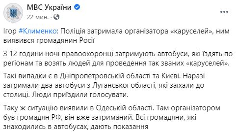 10:48 Появились подробности попытки подкупа в Одесской области. В Измаиле полиция остановила три автобуса с 52 "карусельщиками". Они должны были ехать в Белгород-Днестровский голосовать. За каждый голос гражданин иностранного государства обещал им по 400 гривен.
