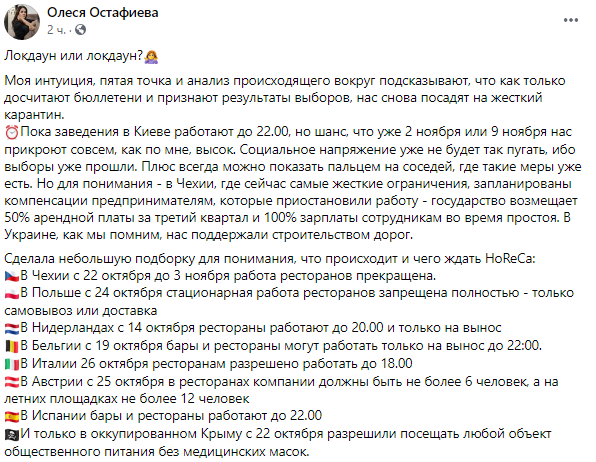 "Пока заведения в Киеве работают до 22:00, но шанс, что уже 2 ноября или 9 ноября нас прикроют совсем, как по мне, высок. Социальное напряжение уже не будет так пугать, ибо выборы уже прошли. Плюс всегда можно показать пальцем на соседей, где такие меры уже есть", - подводит итог Остафиева.