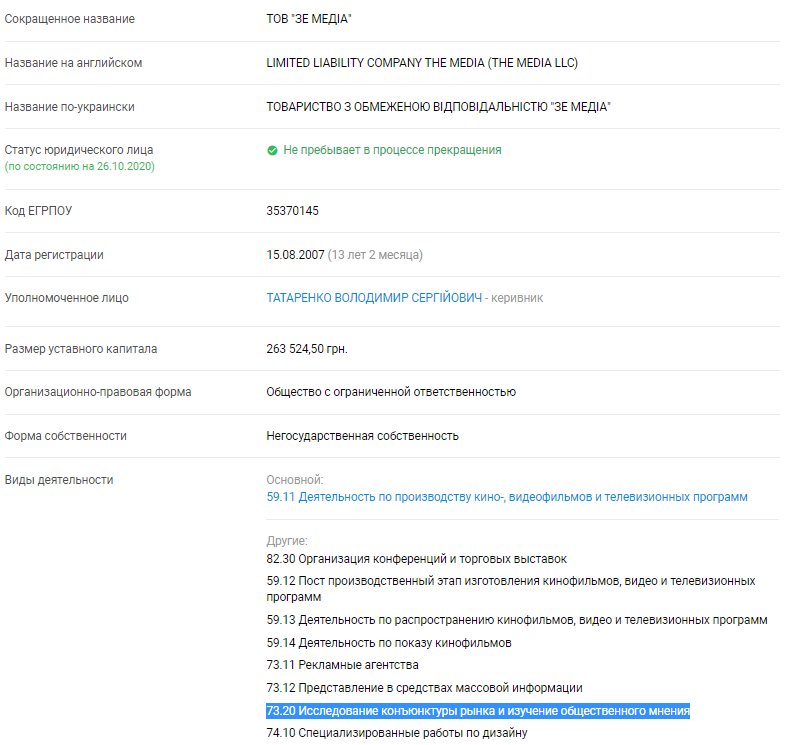 Интересно, что в апреле 2019 года эта компания называлась иначе - "Крунекс". Но на следующий день после второго тура президентских выборов, это ООО стало называться "Зе Медиа".