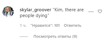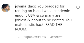 "Ким, есть люди, которые умирают", "прекрати, Ким, эта подпись, ты не так проста", "ты хвастаешься, что арендовала остров, в то время как США охватила пандемия и многие остались без работы и находятся на грани выселения", - пишут подписчики Ким Кардашьян в Instagram.