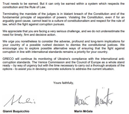 Организации призывают украинскую власть рассмотреть неблагоприятные, глубокие и долгосрочные последствия для Украины от поспешного решения об увольнении судей Конституционного суда.