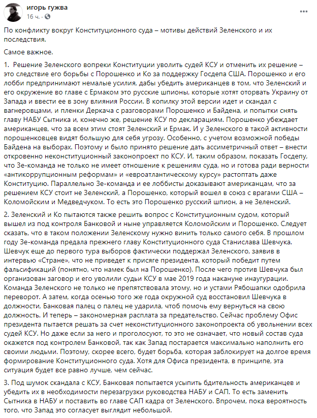 1. Решение Зеленского вопреки Конституции уволить судей КСУ и отменить их решение – это следствие его борьбы с Порошенко и Ко за поддержку Госдепа США. Порошенко и его лобби предпринимают немалые усилия, дабы убедить американцев в том, что Зеленский и его окружение во главе с Ермаком - это русские шпионы, которые хотят оторвать Украину от Запада и ввести ее в зону влияния России.