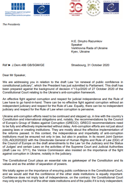 В субботу на имя спикера Разумкова поступило обращение сразу двух европейских структур, которые выступили резко против "зеленского" законопроекта. Речь о Венецианской комиссии и GRECO - Группы государств против коррупции.