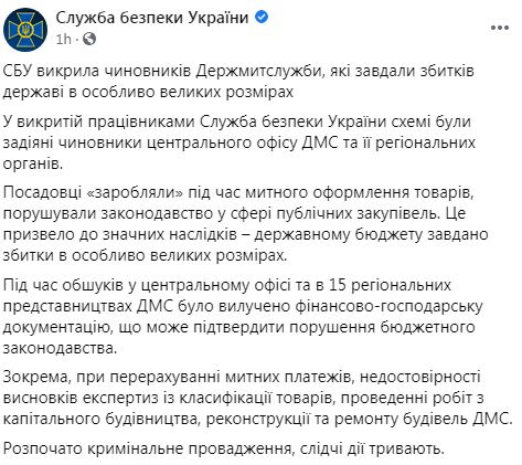"В разоблаченной сотрудниками Службы безопасности Украины схеме были задействованы чиновники центрального офиса ГТС и ее региональных органов. Чиновники "зарабатывали" во время таможенного оформления товаров, нарушали законодательство в сфере публичных закупок. Это привело к значительным последствиям - государственному бюджету нанесен ущерб в особо крупных размерах", - говорится в сообщении СБУ.