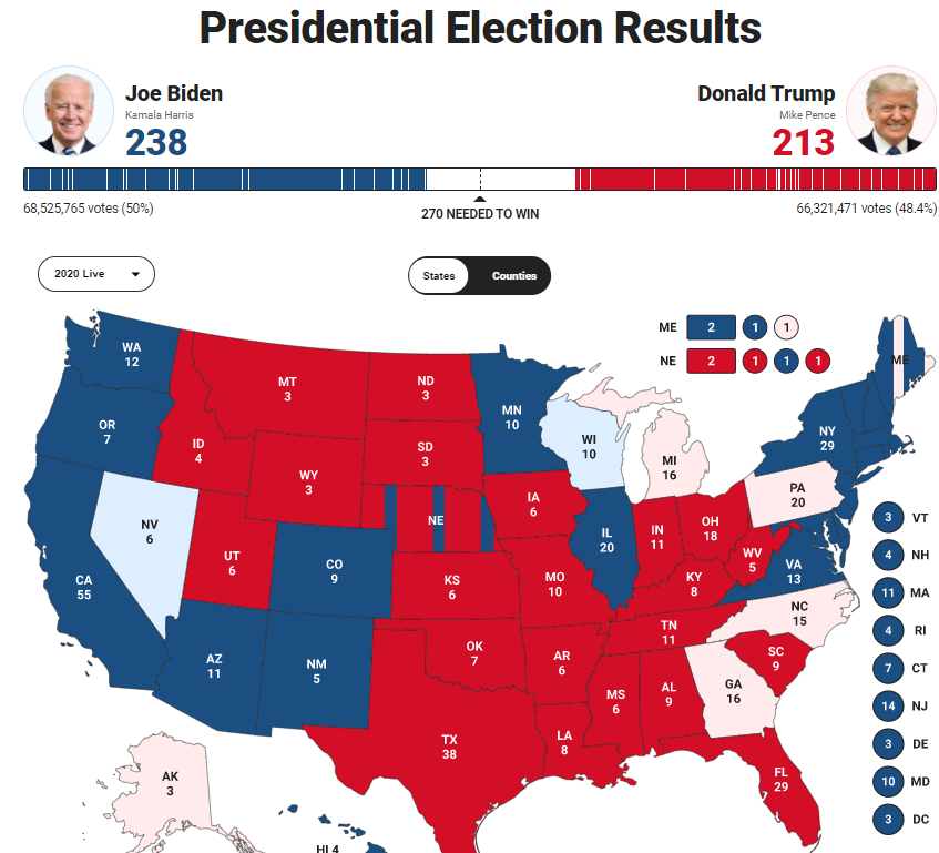 В Неваде и Висконсине преимущество у Байдена. Причем в Неваде оно достаточно уверенное, а во втором штате - с минимальной разницей в 0,3%. То есть Висконсин еще может остаться за президентом.