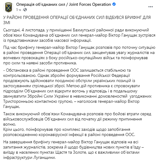 Генерал-майор Ганущак заявил о четырех новых точках разведения сил. Фото: facebook.com/pressjfo.news