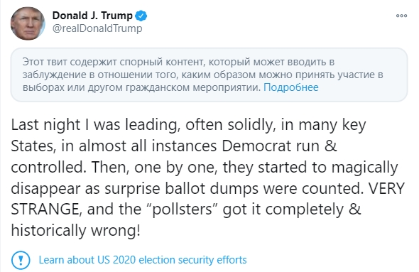 Между тем, Twitter пометил сообщение Трампа о лишении лидерства в ряде штатов как "содержащее спорный контент".
