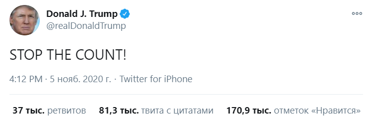 Действующий президент США и кандидат на следующий срок Дональд Трамп призвал остановить пересчет голосов на выборах. Об этом он написал в своем микроблоге в Twitter.