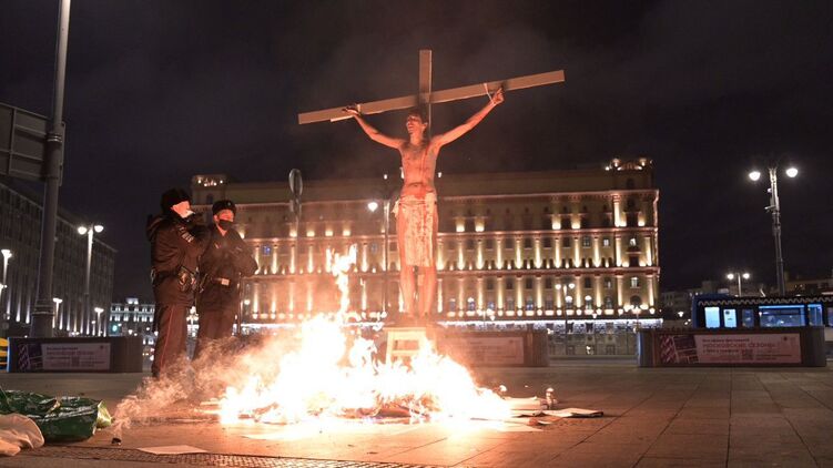 "Активисты собирались провести акцию в поддержку политзаключенных, в ходе нее они облили крест веществом, которое горит при 40℃ и не наносит человеку вреда. На кресте был "распят" активист, а его соратники кидали в огонь тома уголовных дел", - пишет "МБХ медиа".