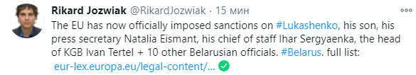 Так,  Евросоюз официально ввел санкции в отношении Лукашенко, его сына, его пресс-секретаря Натальи Эйсмант, главы его администрации Игоря Сергяенко, главы КГБ Беларуси Ивана Тертеля и 10 других белорусских чиновников. Они не смогут въехать в страны ЕС, а их активы будут заморожены.