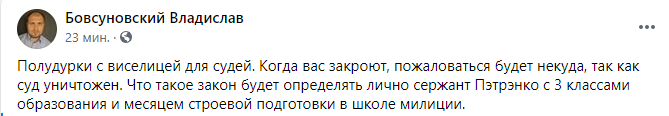 "Полудурки с виселицей для судей. Когда вас закроют, пожаловаться будет некуда, так как суд уничтожен. Что такое закон будет определять лично сержант Пэтрэнко с 3 классами образования и месяцем строевой подготовки в школе милиции", - пишет журналист Владислав Бовсуновский.
