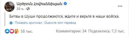 "Бои в Шуши продолжаются, ждите и верьте нашей армии", — сообщил официальный представитель Минобороны Армении Арцрун Ованнисян в Фейсбуке.