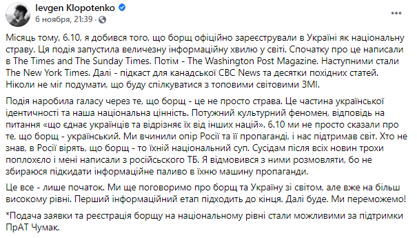 Позже экспертный совет по вопросам нематериального культурного наследия при Министерстве культуры и информационной политики Украины предложил внести борщ в реестр нематериального национального достояния в начале октября. Помимо этого, туда хотят внести клембовскую сорочку с цветком, пасхальное гуляние "Водить Володара" в селе Роскошевка Тепликского района Винницкой области, борщевскую народную вышивку и карпатское лижникарство - технику изготовления покрывал из овечьей шерсти.