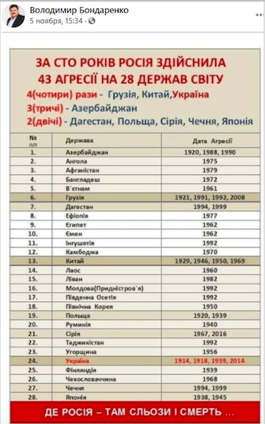 Русских и русскоговорящих граждан Бондаренко, судя по его постам, называет "мокшанами". Чиновник уверен, что их "племена" были "людоедами". Исходя из этого можно лишь догадываться, что он мог сказать медсестре, говорящей по-русски.