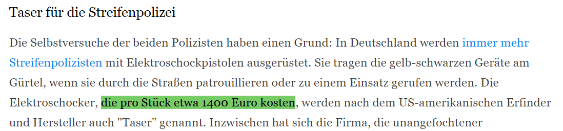 Также немецкие СМИ, когда рассказывали об использовании "Тазеров" своей полицией, говорили, что каждый обходится в 1400 евро. Это порядка 1650 долларов - то есть не 2300, как в Украине, а ближе к цене производителя.