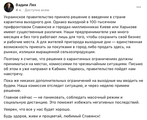 Мэр Славянска Вадим Лях (также участвует во втором туре выборов) отказался вводить карантин выходного дня и добавил, что считает это прерогативой местной власти.
