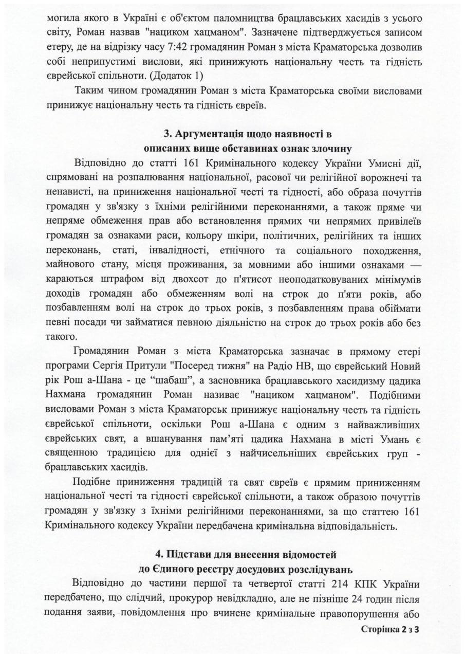 Объединенная еврейская община Украины также сообщила, что не намерена оставлять это дело и относительно высказываний слушателя обратится в полицию Краматорска с заявлением об открытии уголовного дела по ст. 161 УК Украины (разжигание межнациональной розни).