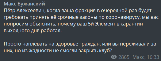 Просто наплевать на здоровье граждан, или вы переживали за них, но из жадности не смогли закрыть клуб?", - пишет нардеп Макс Бужанский.