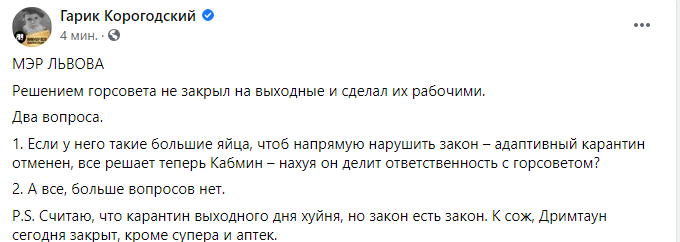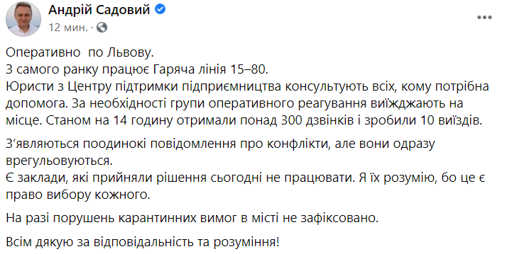 14:12 Андрей Садовой заявил, что нарушений карантина во Львове нет. А юристы выезжают на помощь предпринимателям (видимо, чтобы помогать им в разборках с полицией).