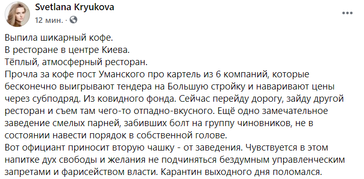 Прочла за кофе пост Уманского про картель из 6 компаний, которые бесконечно выигрывают тендера на Большую стройку и наваривают цены через субподряд. Из ковидного фонда. Сейчас перейду дорогу, зайду другой ресторан и съем там чего-то отпадно-вкусного. Ещё одно замечательное заведение смелых парней, забивших болт на группу чиновников, не в состоянии навести порядок в собственной голове.