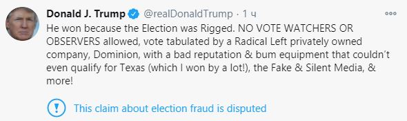 По его словам, победу Байдену обеспечила компания Dominion (производителе ПО для голосования Dominion Voting Systems), у которой было неисправное оборудование, а также СМИ, которые замалчивали нарушения.
