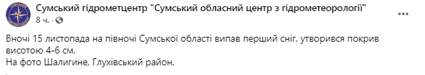 "Ночью 15 ноября на севере Сумской области выпал первый снег, образовался покров высотой 4-6 см. На фото Шалыгино, Глуховский район", - говорится в сообщении.