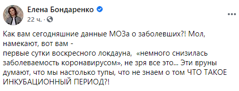 "Как вам сегодняшние данные МОЗа о заболевших?! Мол, намекают, вот вам - первые сутки воскресного локдауна, "немного снизилась заболеваемость коронавирусом", не зря все это... Эти вруны думают, что мы настолько тупы, что не знаем о том, что такое инкубационный период?", - интересуется экс-нардеп Елена Бондаренко.