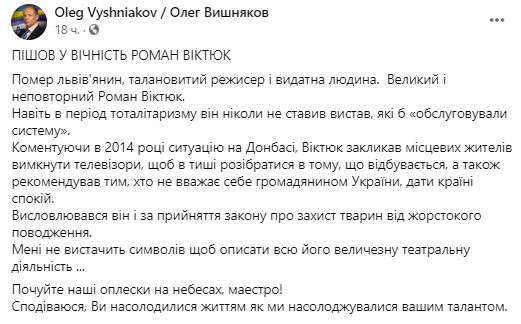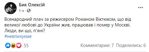 "Всенародный плач по режиссеру Роману Виктюку, который от большой любви к Украине жил, работал и умер в Москве. Люди, вы что, пьяные?" - написал Бык.