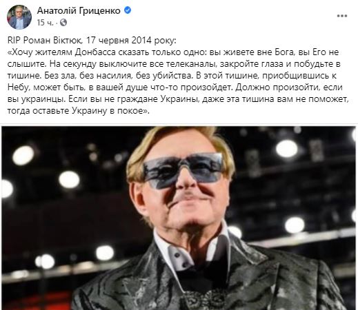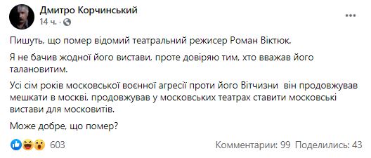 "Пишут, что умер известный театральный режиссер Роман Виктюк. Я не видел ни одного его представления, но доверяю тем, кто считал его талантливым. Все семь лет московской военной агрессии против его Родины он продолжал жить в Москве, продолжал в московских театрах ставить московские спектакли для московитов. Может хорошо, что умер?" - написал Корчинский.