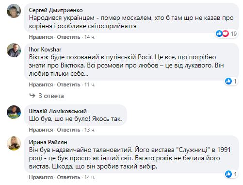 В комментариях к посту Корчинского пишут о Виктюке, что он "родился украинцем - умер москалем", "будет похоронен в путинской России" и что он "что был, что не было".