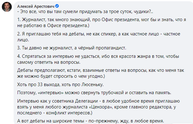 На претензию внезапно ответил Арестович - хотя она его никак не касалась. Но явно затрагивала парафию Зеленского, что и вынудило Алексея начать гибридную войну в соцсетях.