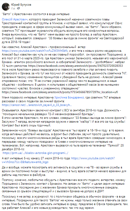 "Заявленное число "боевых выходов" Арестовича в "тыл врага" в 18-19-м году в то время, когда активных действий не велось, а фронт был стабилен, звучит просто удивительно, поскольку все эти многочисленные рейды в тыл врага Арестович совершал мимоходом, в перерывах между частыми поездками в Киеве и многочисленными интервью на телеканалах", - написал журналист.