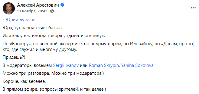 Арестович ответил в комментариях и назвал Бутусова "черным пропагандистом", а не журналистом. И от интервью с ним отказался, настаивая на дебатах.
