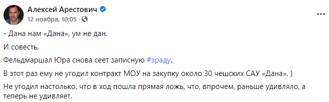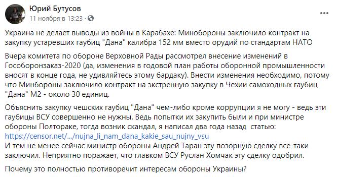 Все началось с поста главреда "Цензора" от 11 ноября, в котором тот раскритиковал Минобороны за закупку гаубиц "Дана". Они, по мнению Бутусова, устарели.