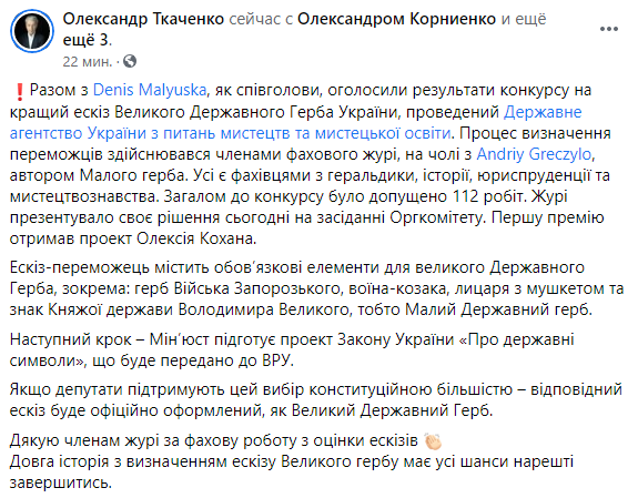 "Вместе с Денисом Малюськой, как сопредседатели, объявили результаты конкурса на лучший эскиз большого Государственного герба Украины, проведенного Государственным агентством Украины по вопросам искусств и художественного образования. Жюри представило свое решение сегодня на заседании Оргкомитета. Первую премию получил проект Алексея Кохана", - рассказал Ткаченко.