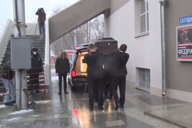 Судя по снимкам, которые публикует Telegram-канал РИА "Новости", гроб с телом вынесли на основную сцену театра. Его практически полностью укрывают цветы и венки от друзей, коллег и организаций.