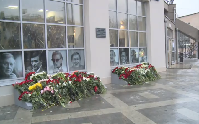 Многие люди оставляют цветы у театра, чтобы выразить почтение гению.