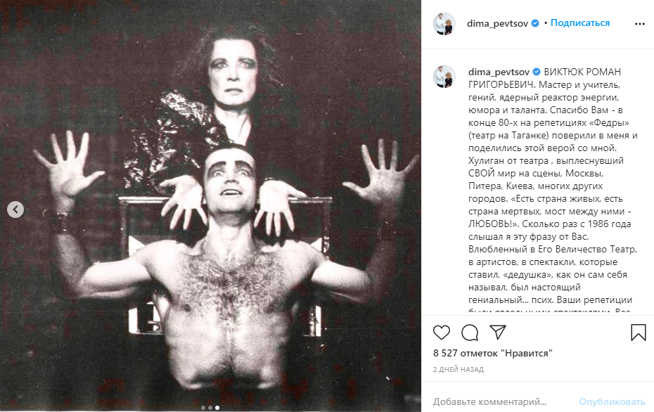 Многие артисты делятся своей скорбью в социальной сети. "Виктюк Роман Григорьевич. Мастер и учитель, гений, ядерный реактор энергии, юмора и таланта. Спасибо Вам - в конце 80-х на репетициях "Федры" (театр на Таганке) поверили в меня и поделились этой верой со мной. Хулиган от театра, выплеснувший свой мир на сцены, Москвы, Питера, Киева, многих других городов. "Есть страна живых, есть страна мертвых, мост между ними - любовь!". Сколько раз с 1986 года слышал я эту фразу от Вас. Влюбленный в Его Величество Театр, в артистов, в спектакли, которые ставил, "дедушка", как он сам себя называл, был настоящий гениальный... псих. Ваши репетиции были отдельными спектаклями, Вас пародировали влюбленные в Вас артисты еще долго, после премьеры, поставленного Вами спектакля... А сколько актерских имен вы открыли, я - в их числе. Спасибо, Мастер, Учитель, царствие вам Небесное", - написал Дмитрий Певцов.