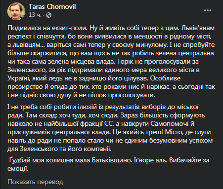 "Посмотрел на экзитполы. Ну и живите теперь с этим. Львовянам респект и сочувствие, потому что они оказались в меньшинстве в родном городе, а львивцям... Варитесь сами теперь в своем прошлом. И не вздумайте больше жаловаться, что вам что-то не так делает "зеленая" центральная или такая же "зеленая" местная власть", - написал Черновол.