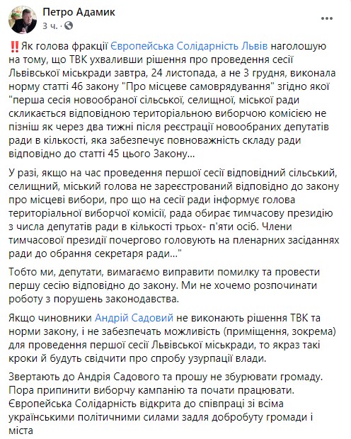 "Андрей Садовой, прекратите истерию! Никто не "узурпирует власть". Как минимум - из числа новоизбранных депутатов. Мы только требуем от горизбиркома выполнять норму статьи 46 закона Украины "О местном самоуправлении", - написал глава фракции партии "Европейская солидарность" во Львовском горсовете Петр Адамык на своей странице в Facebook.