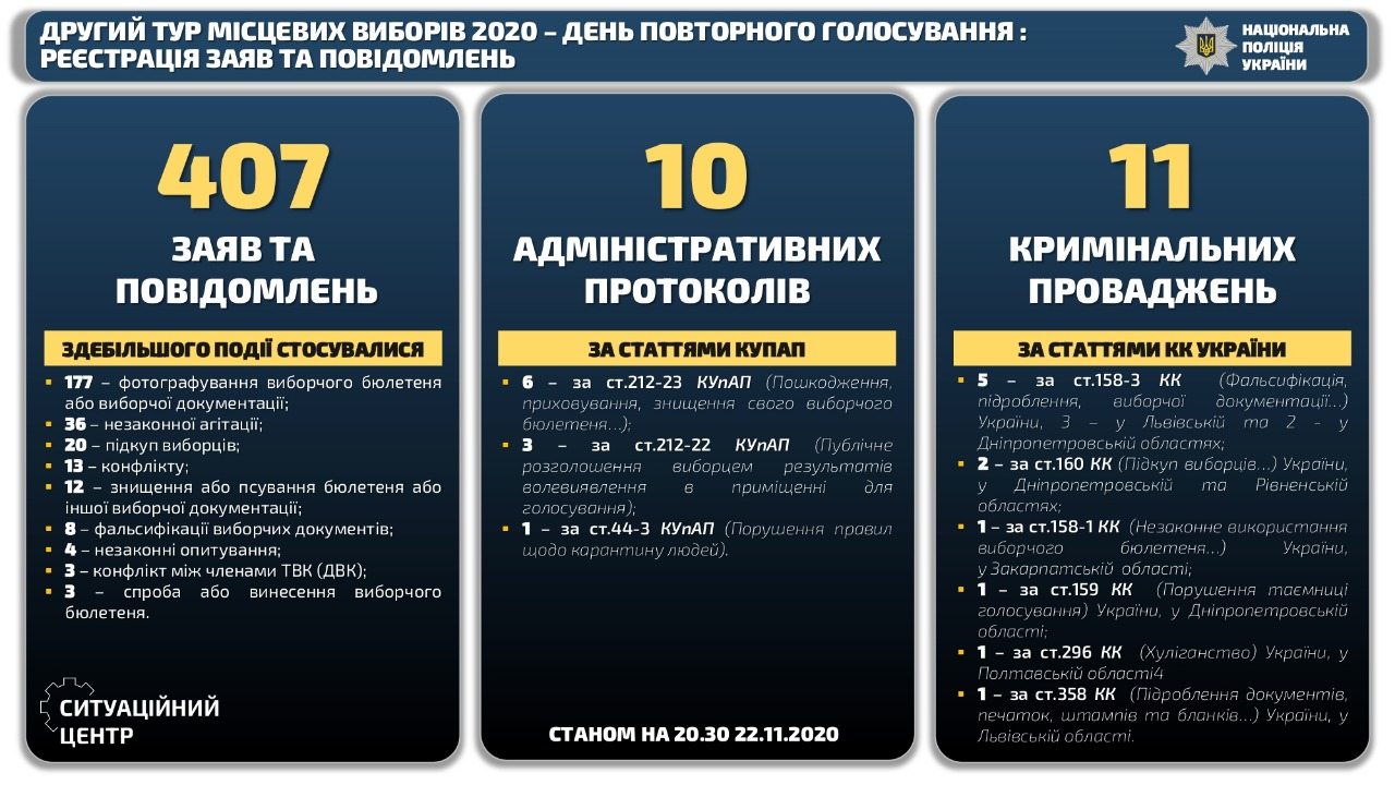 09:21  Предвыборный день - суббота - была полна всяческих нарушений, сообщает Нацполиция. За сутки открыли три уголовных дела. Всего за период местных выборов было открыто более тысячи таких производств.