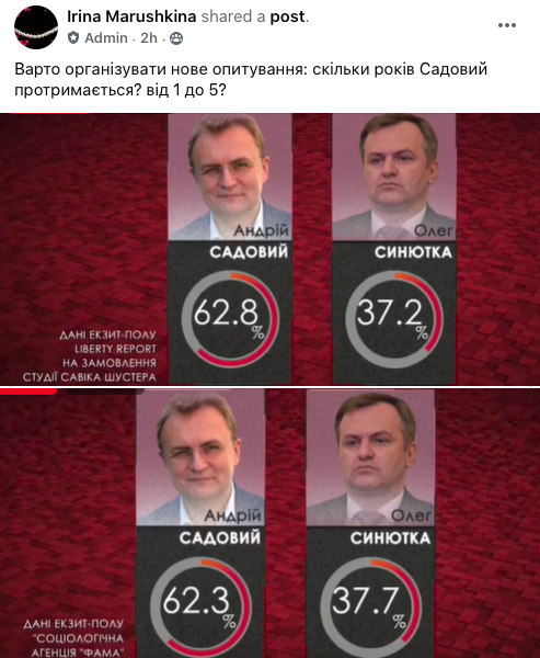 По данным экзитполов, Садовой набрал почти вдвое больше голосов (62% против 37%).