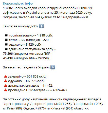 По состоянию на утро среды 25 ноября, в Украине подтвердились 13 882 новых случая заражения коронавирусом.