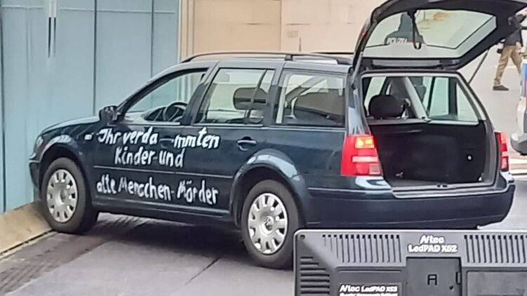 Авто с надписью "проклятые убийцы детей и стариков" въехал сегодня в ворота офиса канцлера Германии. Фото: Telegram-кагал/ РИА "Новости"