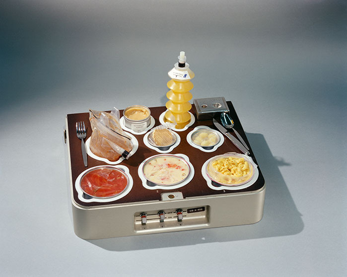Сейчас поднос с едой, похожий на те, что астронавты использовали на борту Скайлэба, с едой, посудой и чистыми салфетками. А сам поднос согревал еду.