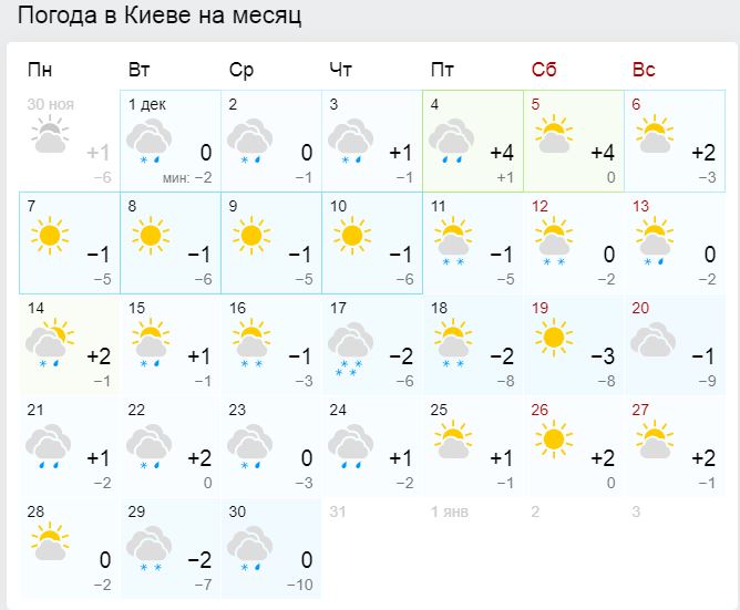 По данным сайта Gismeteo, в Киеве в первую неделю декабря будет идти снег с дождем. С 7 декабря выглянет солнце и установится небольшой мороз: -1 днем и -5...-6 ночью.